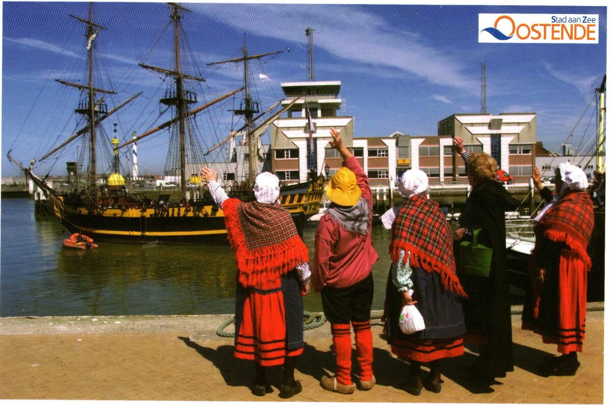 Tropic T 469. - (Oostende voor Anker). - Enkele leden van de "Vismijnvrienden" zwaaien naar het zeilschip "Grand Turk" die voorbijvaart in het Montgomerydok