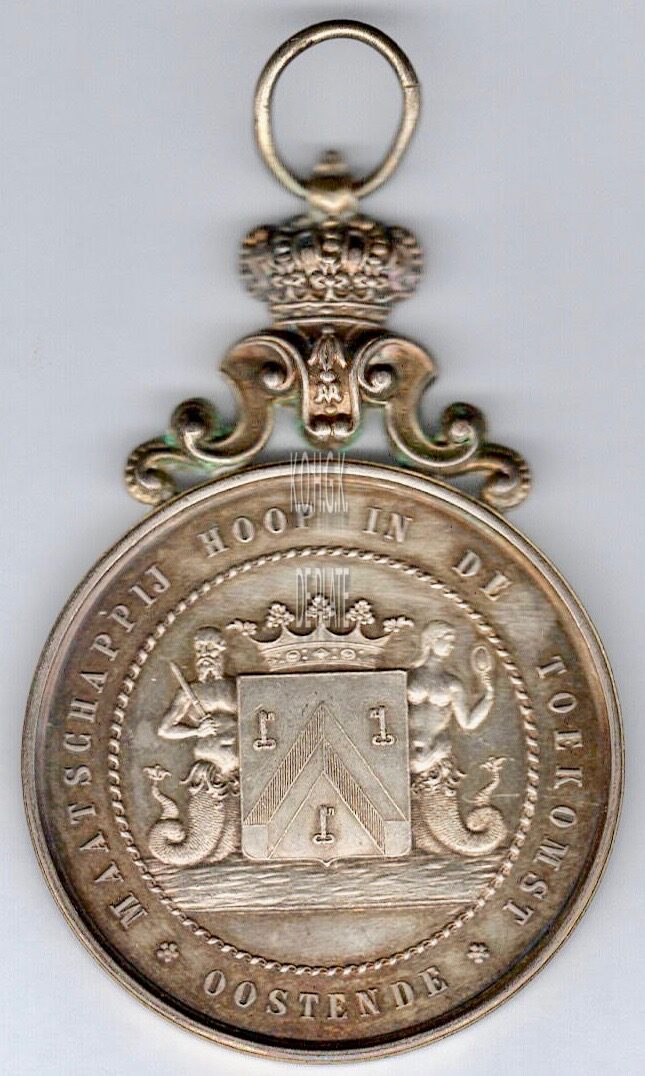 Op de voorzijde :  rondom MAATSCHAPPIJ HOOP IN DE TOEKOMST ✿ OOSTENDE ✿, in een parel binnen cirkel het gekroonde wapenschild met keper en drie sleutels van de stad Oostende, geflankeerd door twee schildhouders, links meerman met zwaard naar links kijkend, rechts meermin met handspiegel naar rechts in haar spiegel kijkend, alles geplaatst boven de zee.