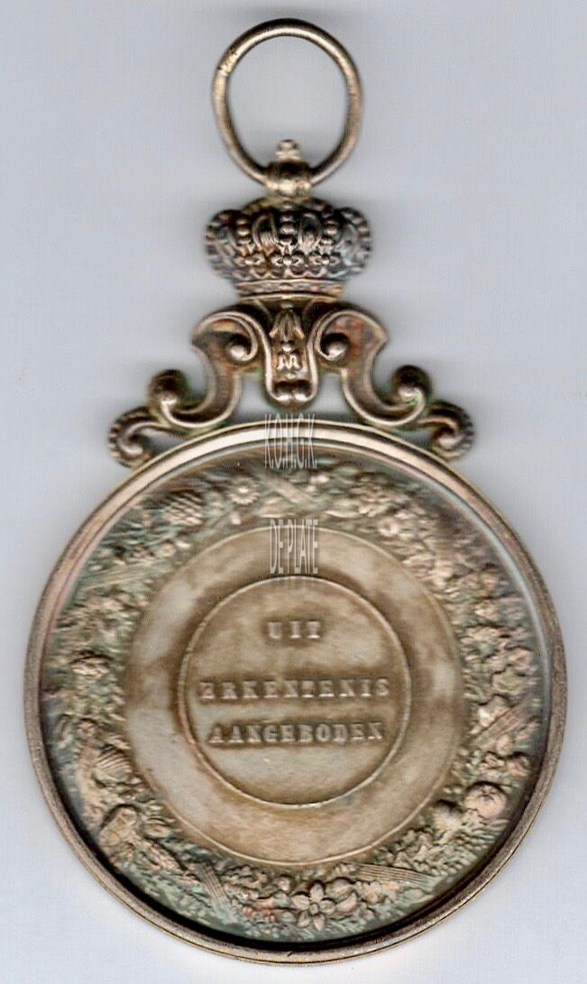 Op de keerzijde : rondom een gesloten krans van bloemen en vruchten, centraal in een binnencirkel UIT / ERKENTENIS / AANGEBODEN