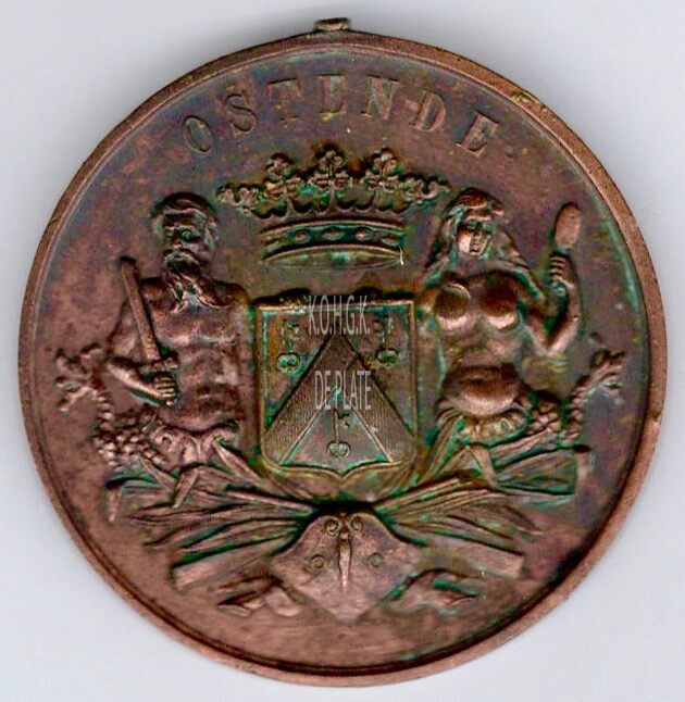 Op de voorzijde :  rondom boven OSTENDE, centraal het gekroonde wapenschild met keper en drie sleutels van de stad Oostende, geflankeerd door twee schildhouders, links meerman met zwaard naar links kijkend, rechts meermin met handspiegel naar rechts kijkend, geplaatst boven een boeg op zee en gevuld met palmbladeren en twee gekruiste roeispanen