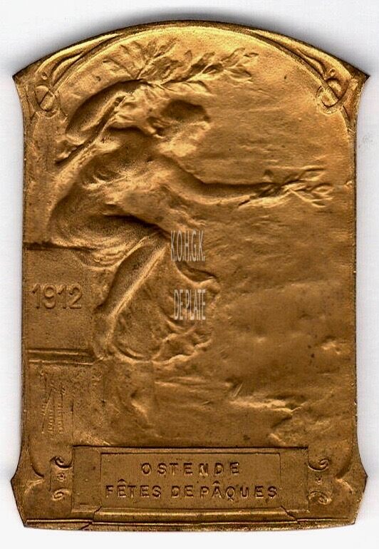 Op de voorzijde : ‘Allegorie de roem’ : links een vrouw zittend op een balkon met in de linkerhand een lauriertak, zij houdt zich vast aan een boomtak, links in het balkon horizontaal 1912, onderaan in een rechthoekig veld voor gravure OSTENDE / FÊTES DE PÂQUES