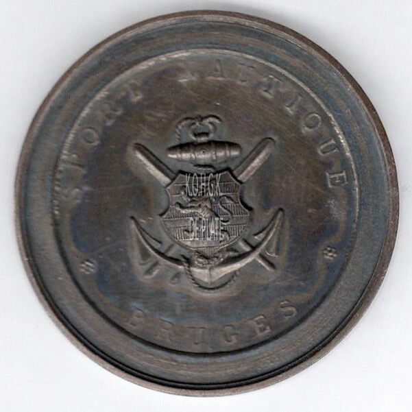 Op de keerzijde : rondom links en rechts lauriertakken verstrengeld met eikentakken en onderaan samengestrikt, centraal in een cirkel rondom boven LE R.S.N., horizontaal BRUGES / AU / R.S.N. / OSTENDE / 1871-1925