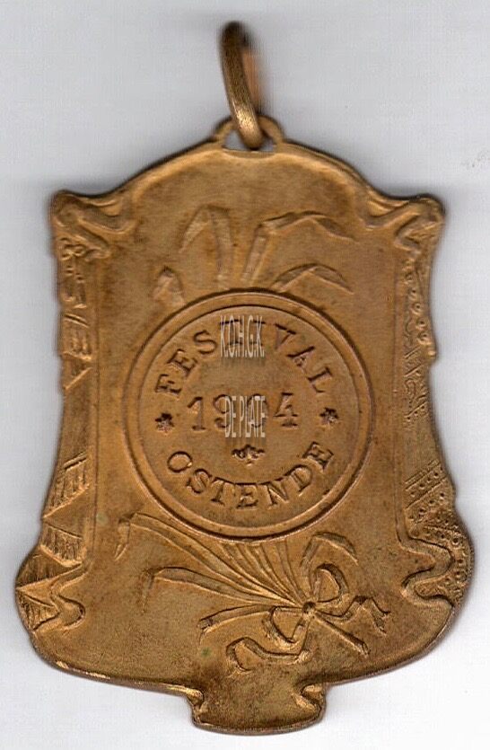 Op de keerzijde : rondom een open toneelgordijn, centraal in het midden een palmtak onderaan samengestrikt, erboven op een binnencirkel met rondom boven ✿ / FESTIVAL / ✿ / OSTENDE, horizontaal 1904