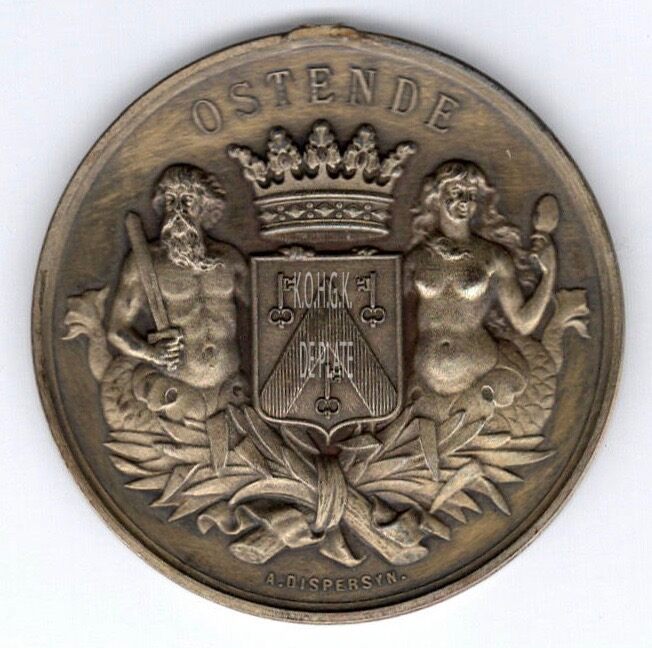 Op de voorzijde : rondom boven OSTENDE, centraal het gekroonde wapenschild met keper en drie sleutels van de stad Oostende, geflankeerd door twee schilhouders, links meerman met zwaard, rechts meermin met handspiegel alles geplaatst op palmbladeren samengebonden met lint, rondom onder gesigneerd A. DISPERSYN