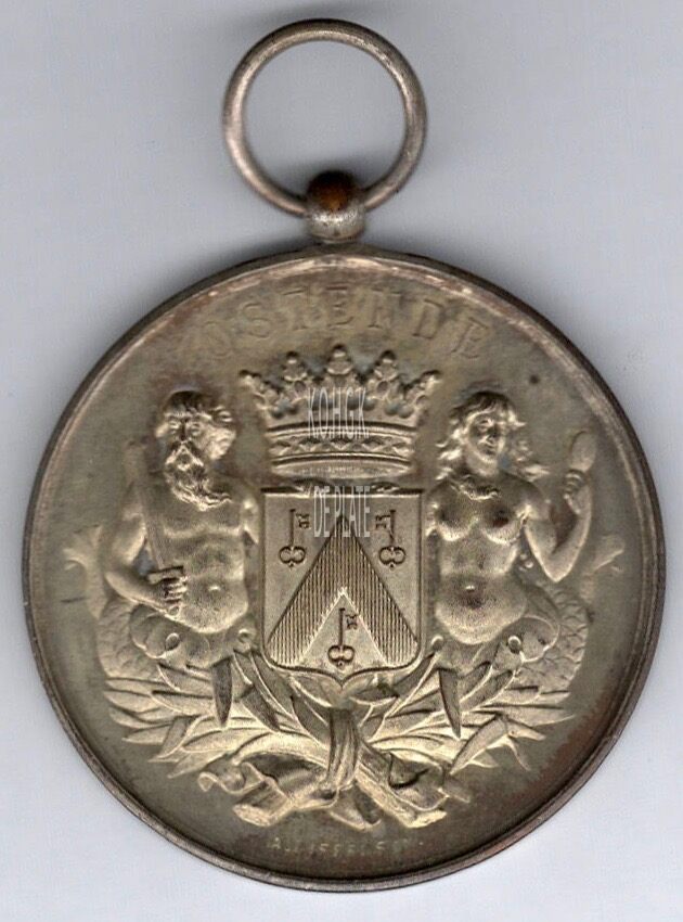 Op de voorzijde : rondom boven OSTENDE, centraal het gekroonde wapenschild met keper en drie sleutels van de stad Oostende, geflankeerd door twee schildhouders, links meerman met zwaard, rechts meermin met handspiegel alles geplaatst op palmbladeren samengebonden met lint