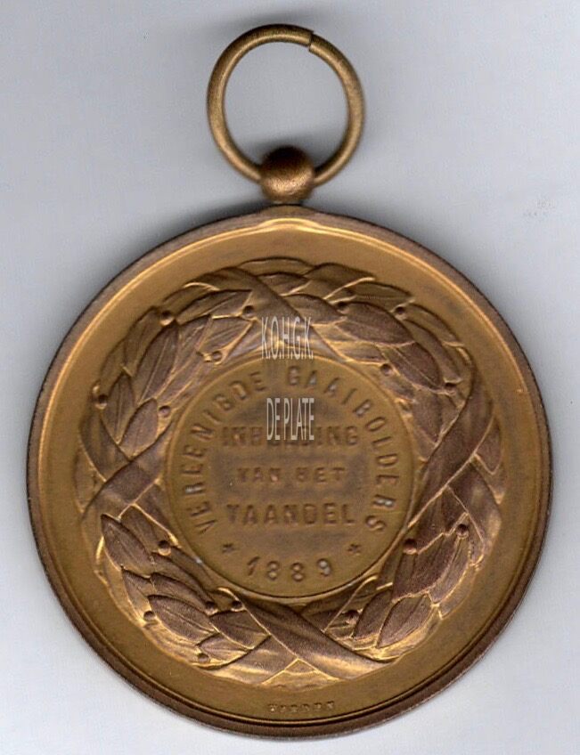 Op de keerzijde : rondom een lauwerkrans, rondom onder gesigneerd WURDEN, centraal in een cirkel boven rondom VEREENIGDE GAAIBOLDERS, horizontaal INHULDING / VAN HET / VAANDEL, rondom onder ✭/ 1889 / ✭
