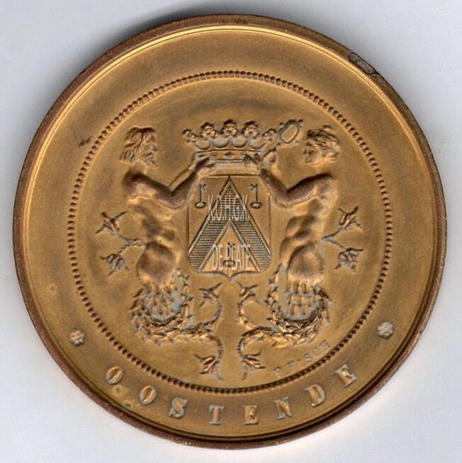 Op de voorzijde : rondom onder  tussen twee ingeslagen rozen OOSTENDE, centraal in een parelcirkel het gekroonde wapen met keper en drie sleutels van de stad Oostende, geflankeerd door twee schildhouders, links meerman rechts meermin met handspiegel die de kroon vasthouden en naar elkaar kijkene, onder de meermin gesigneerd F. FISCH