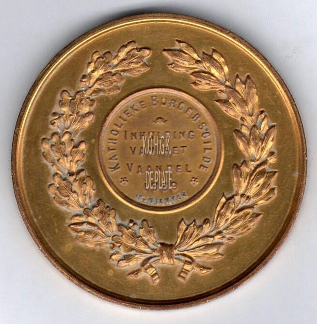 Op de keerzijde : rondom een eikentak (links) samengestrikt met een lauriertak (rechts), centraal in een cirkel boven rondom boven KATHOLIEKE BURGERSGILDE, horizontaal INHULDING / VAN HET  / VAANDEL, rondom onder ✭/ 1889 / ✭,eronder gesigneerd (onleesbaar)