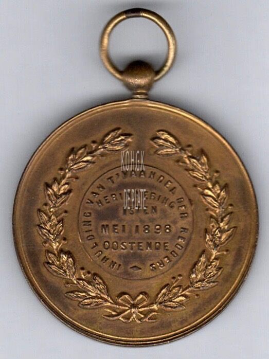 Op de keerzijde : rondom twee lauriertakken onderaan samengestrikt, centraal in een cirkel, rondom INHULDING VAN T’ VAANDEL DER REDDERS ~, horizontaal HERINNERING (licht gebogen) / 1sten / MEI 1898 / OOSTENDE