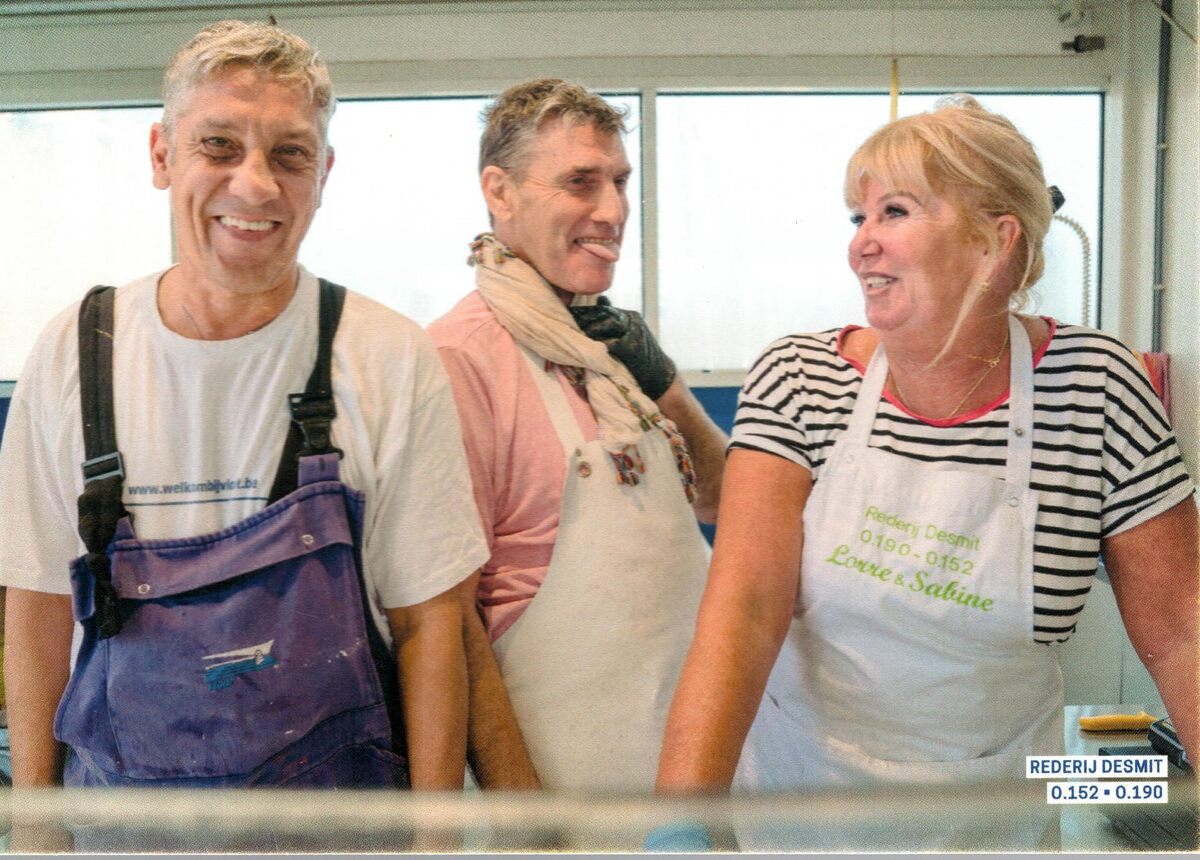 Formaat : 10,5 x 15 cm. - De garnalen uit de Oostendse garnaalkroketten komen rechtstreeks van onze vissers. - Familie Desmit op de vistrap. Links met blauwe overall John Desmit, matroos bij DAB Vloot (info door Adriën Barbé)