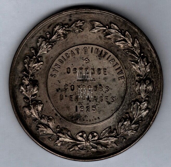 Op de keerzijde : rondom een eikentak (links) onderaan samen gestrikt met een lauriertak (rechts), centraal in een medaillon rondom boven SYNDICAT D’INITIATIVE, horizontaal OSTENDE / CONCOURS / D’ÉTALAGES / 1926, hieronder gesigneerd A.FONTAINE