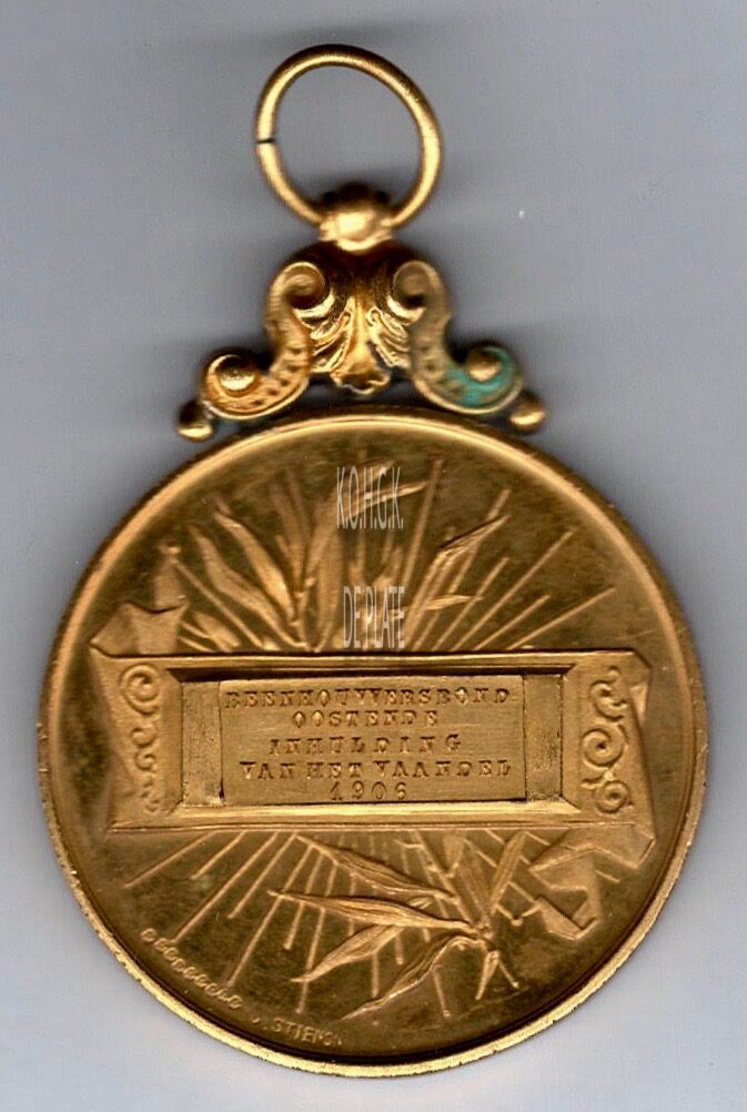 Op de keerzijde : centraal palmtakken en zonnestralen met daarop een breed lint met horizontaal BEENHOUWERSBOND / OOSTENDE / INHULDING (SIC) / VAN HET VAANDEL / 1906.