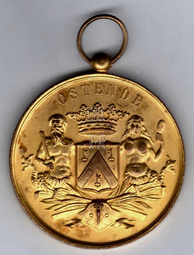 Op de voorzijde : Rondom boven OSTENDE, het gekroonde wapenschild met keper en drie sleutels van de stad Oostende, geflankeerd door twee schildhouders, links meerman met zwaard naar links kijkend, rechts meermin met handspiegel naar rechts kijkend, geplaatst boven een boeg op zee en gevuld met palmbladeren en twee gekruiste roeispanen