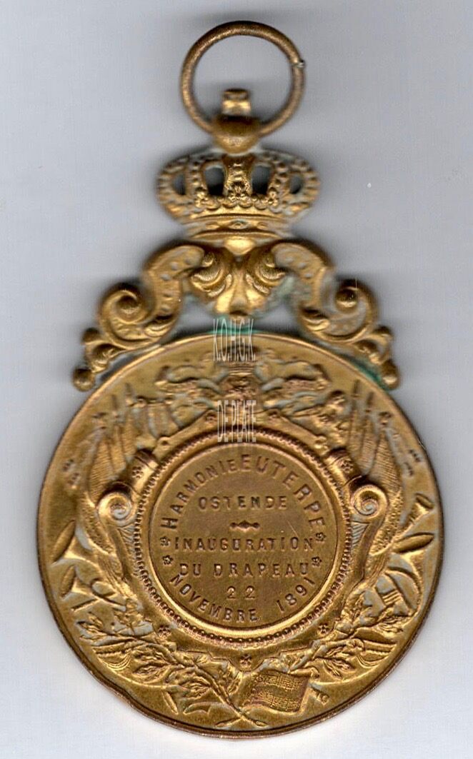 Op de keerzijde : rondom allerlei muziekinstrumenten, boven centraal het Belgisch wapen met aan weerszijden 3 vlaggen, in een medaillon met parelrand rondom boven HARMONIE EUTERPE, rondom onder NOVEMBRE 1891, horizontaal OSTENDE / INAUGURATION DU DRAPEAU / 22