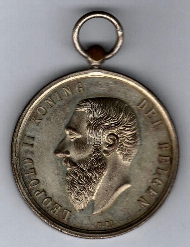 Op de voorzijde : rondom links LEOPOLD II KONING, centraal het hoofd van koning Leopold II in profiel naar links gericht, rondom rechts DER BELGEN, gesigneerd onder de hals H.F.T.