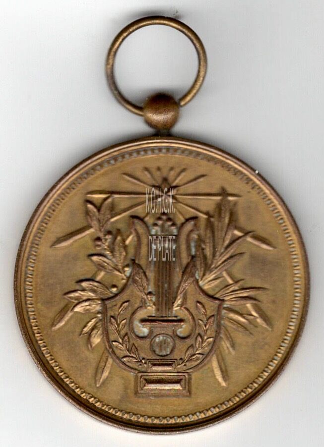 Op de voorzijde : centraal een lier met links een lauriertak, rechts een palmtak, boven de lier een stralende ster
