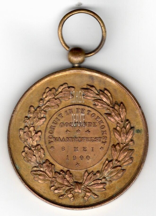 Op de keerzijde : rondom links een eikentak onderaan samen gestrikt met een lauriertak rondom rechts, centraal in een medaillon rondom boven ❃VOORUIT IN DE TOEKOMST❃, horizontaal OOSTENDE / ⇒ ❃ ⇐ / VAANDELFEEST / 6 MEI / 1900 ❃