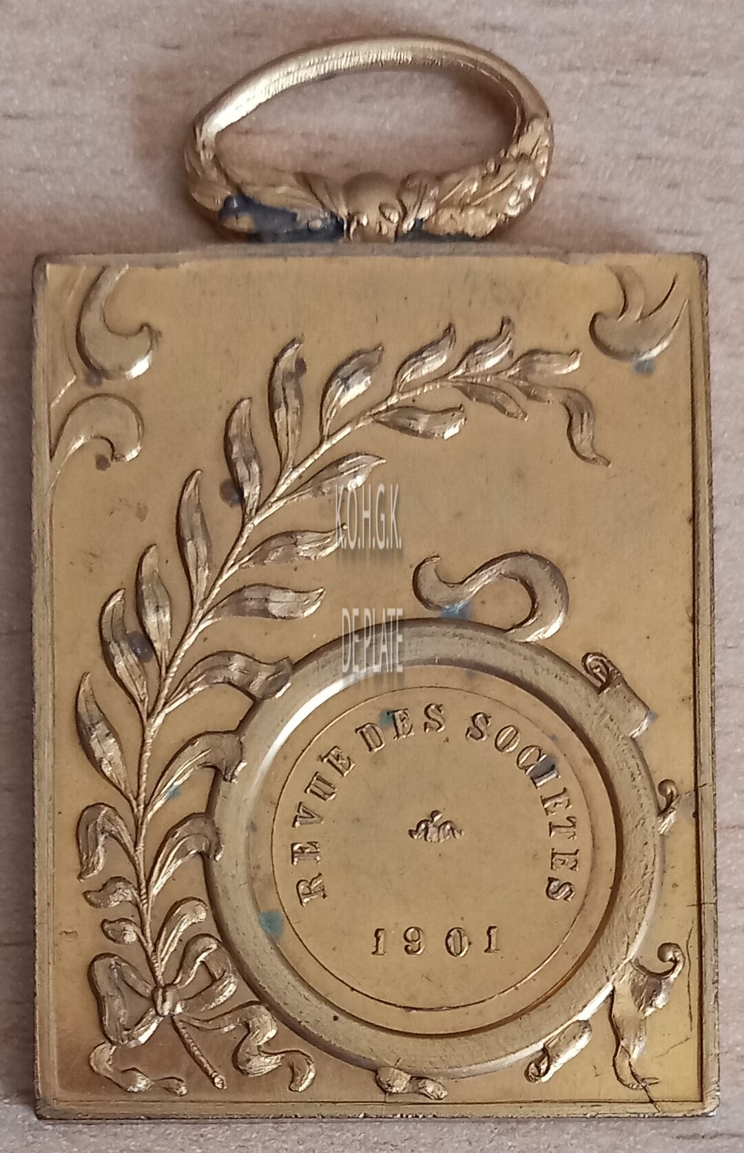 Op de keerzijde : links een lauriertak met onderaan een strik, in de rechterbenedenhoek in een medaillon, rondom boven de tekst REVUE DES SOCIETES, horizontaal ❃ / 1901