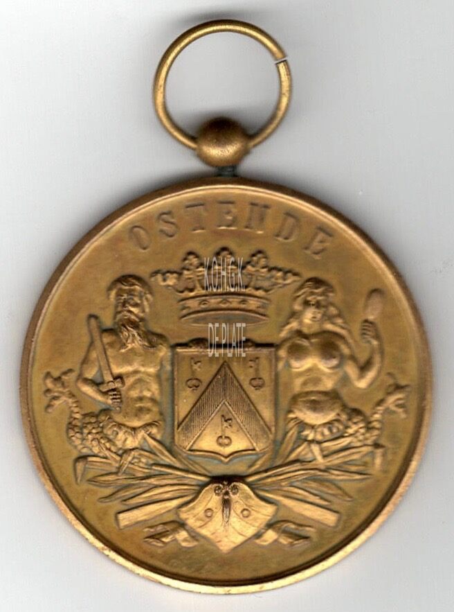 Op de voorzijde : rondom boven OSTENDE, het gekroonde wapenschild met keper en drie sleutels van de stad Oostende, geflankeerd door twee schildhouders, links meerman met zwaard naar links kijkend, rechts meermin met handspiegel naar rechts kijkend, geplaatst boven een boeg op zee en gevuld met palmbladeren en twee gekruiste roeispanen