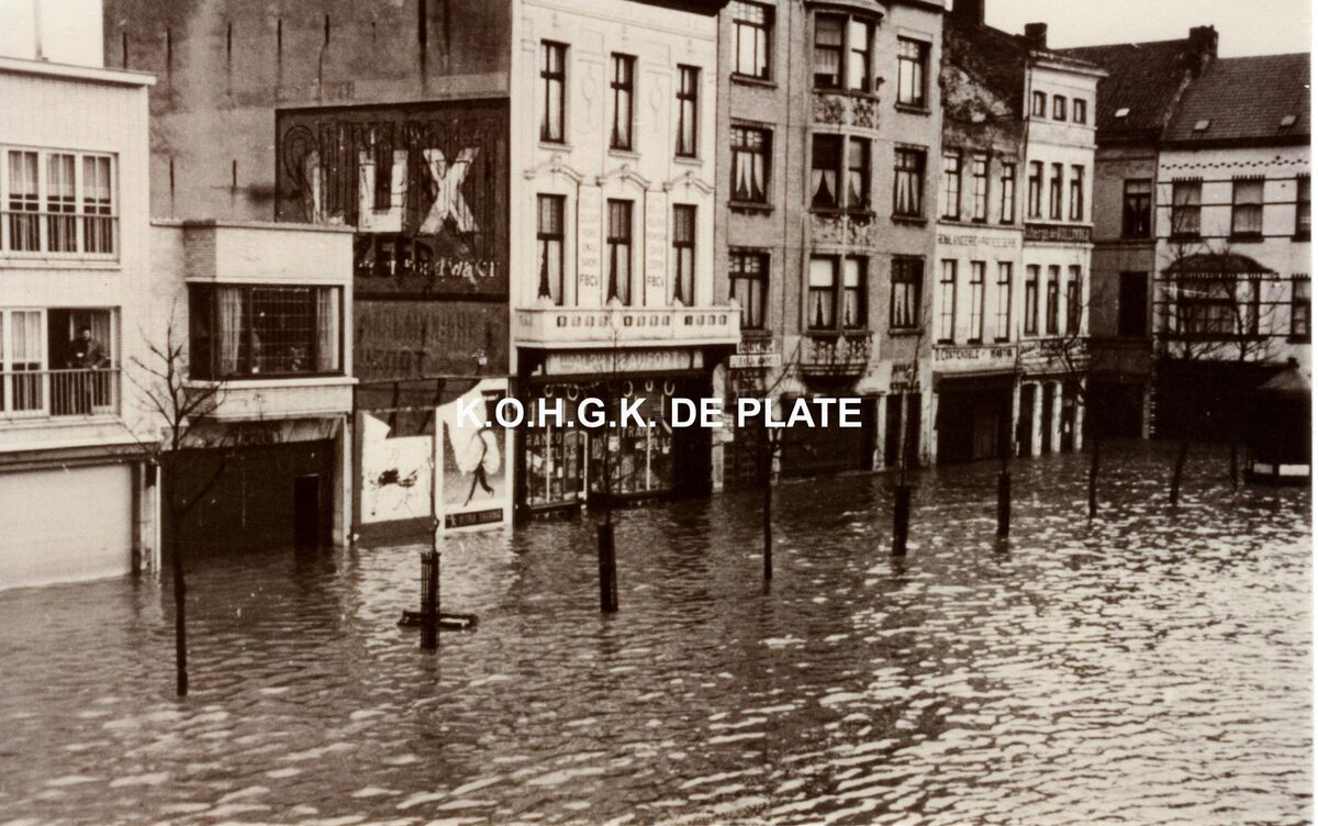 Formaat : 9 x 14 cm. - De Groentemarkt. De huizenrij tussen de Nieuwstraat (links) en de Dwarsstraat