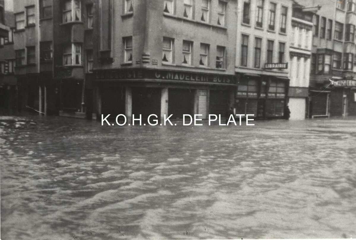 Formaat : 10 x 15 cm. - De hoek van de Madridstraat (links) en de Adolf Buylstraat gezien vanaf het Marie-Joséplein. Op de hoek de winkel van bandagist G. Madelein-Buys en ernaast boekhandel Corman