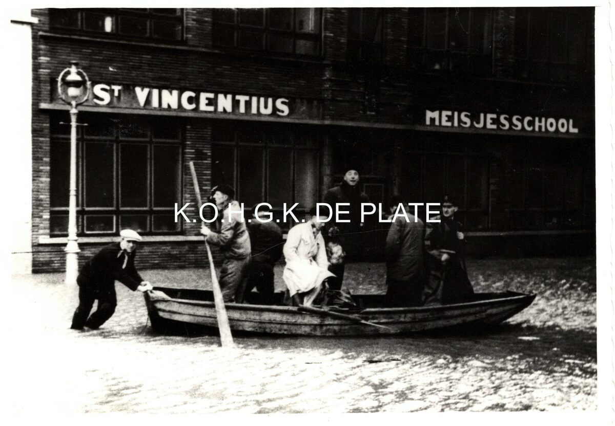 Formaat : 10 x 15 cm. - De Sint-Vincentius meisjeschool in de Ooststraat, gezien vanaf het Vissersplein. De jol als vervoermiddel
