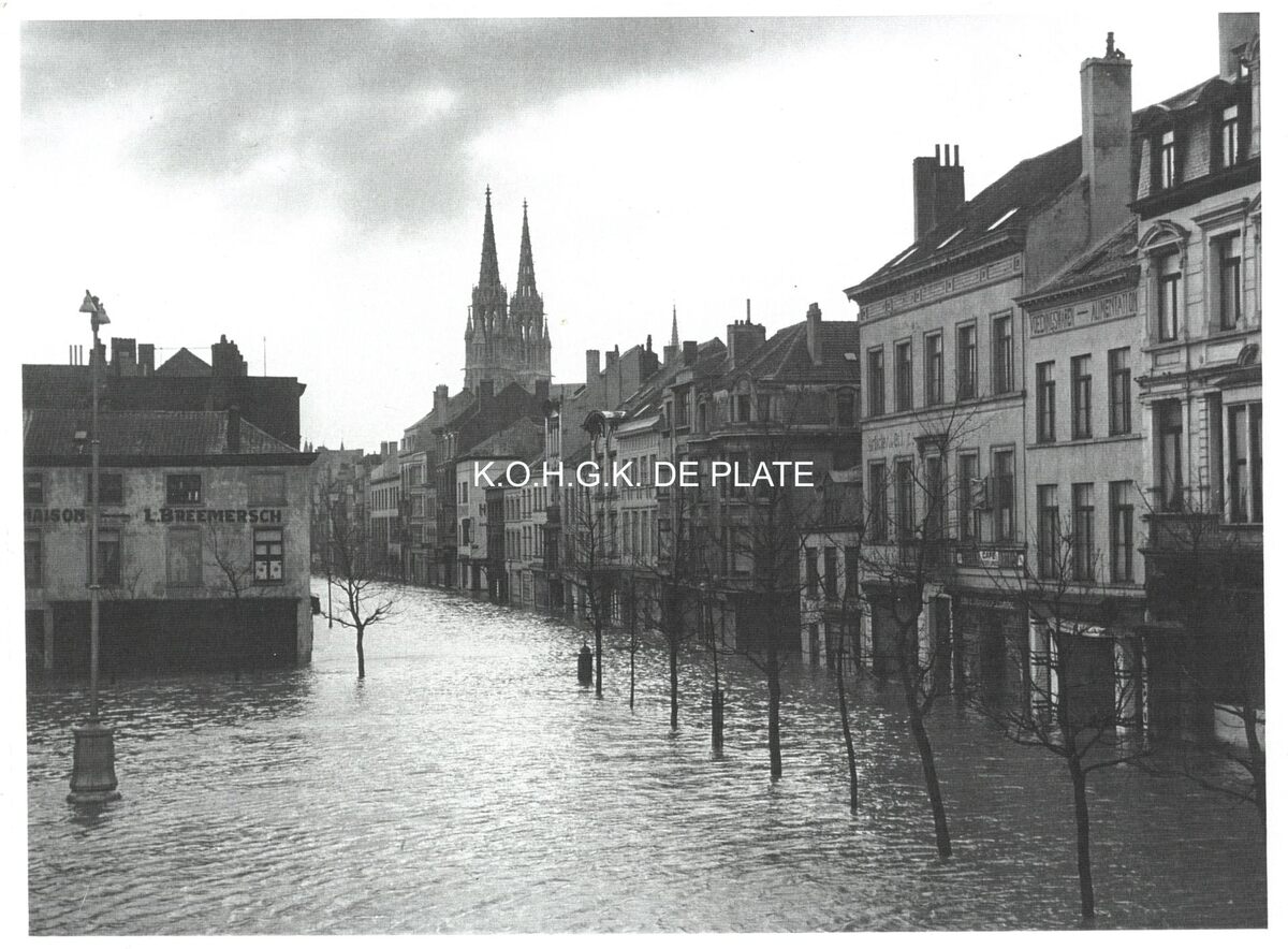 Formaat : 18 x 24 cm. - De Groentemarkt en rechtdoor de Kaaistraat. Links, op de hoek met de Dwarsstraat, de porseleinwinkel "Breemersch". Op de achtergrond, de torens van de Sint Petrus en Pauluskerk