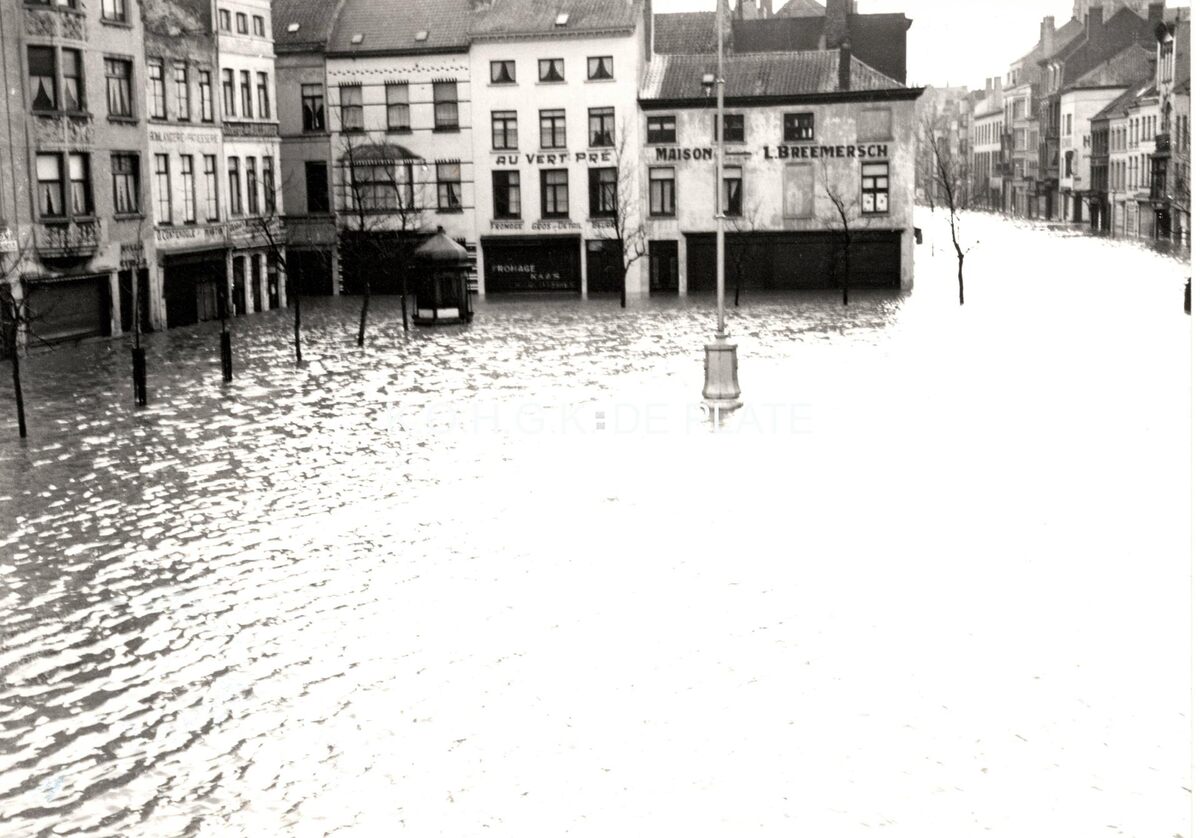 Formaat : 12,5 x 17,5 cm. - De Groentemarkt en rechts, de Kaaistraat. Op de hoek met de Dwarsstraat, de porseleinwinkel "Breemersch" en ernaast de kaaswinkel "Au Vert Pre". Links in de hoek, het paviljoentje ontworpen door Alban Chambon. Daar wordt het debiet van het rioolwater geregeld.