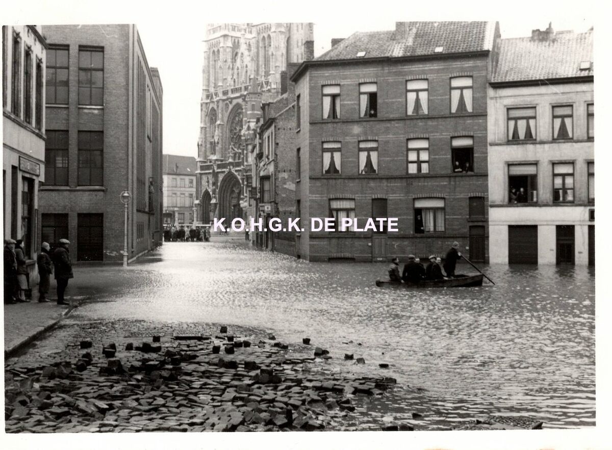 Formaat : 7,5 x 10,5 cm. - Rechtdoor, de Pastoor Pypestraat met op de achtergornd de Sint Petrus en Pauluskerk. Links en rechts, de Sint-Franciscusstraat, met links op de hoek, de Vrije Visserijschool "Paster Pype".