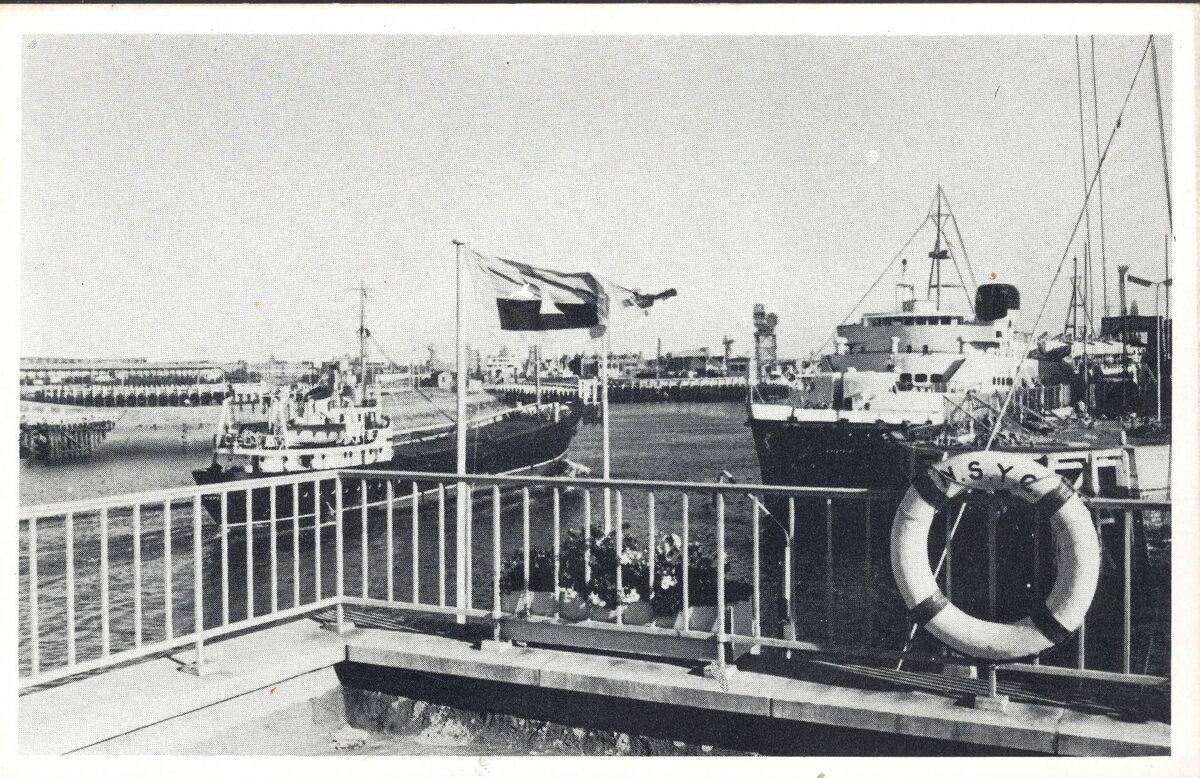 Mess. Driekroezen, Brugge. - Oostende - Vertrek van de Maalboot Koningin Elisabeth. - Ostende - Départ de la Malle Reine Elisabeth. - Een vrachtschip van de Oostende Tilbury lijn vaart de haven binnen. De pakketboot "Koningin Elisabeth" klaar voor vertrek. Foto genomen van op de Royal North Sea Yacht Club