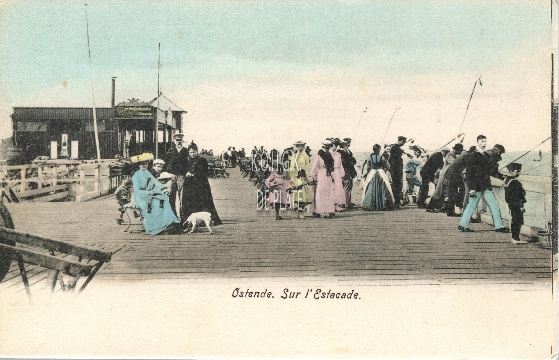 Ostende - Sur l'Estacade. - Bijgekleurde kaart. - Het einde van het Westaketsel met het café-paviljoen, waar je op het terras kon genieten van de gezonde zeelucht. Oostende in de Belle Epoque
