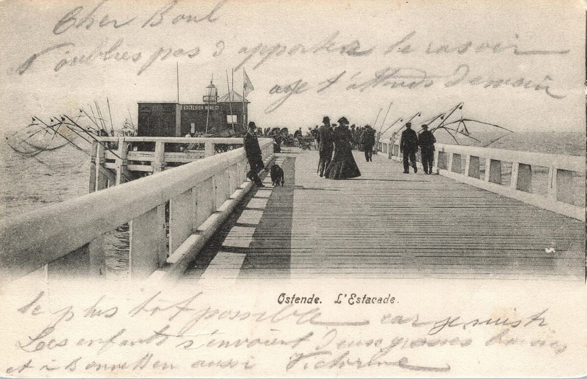 Ostende - L'Estacade. - Het einde van het Weststaketsel met het café-paviljoen waar je op het terras kon genieten van de gezonde zeelucht. Met een kruisnet kon je proberen een krabbetje of visje te vangen. Oostende in de Belle-Epoque