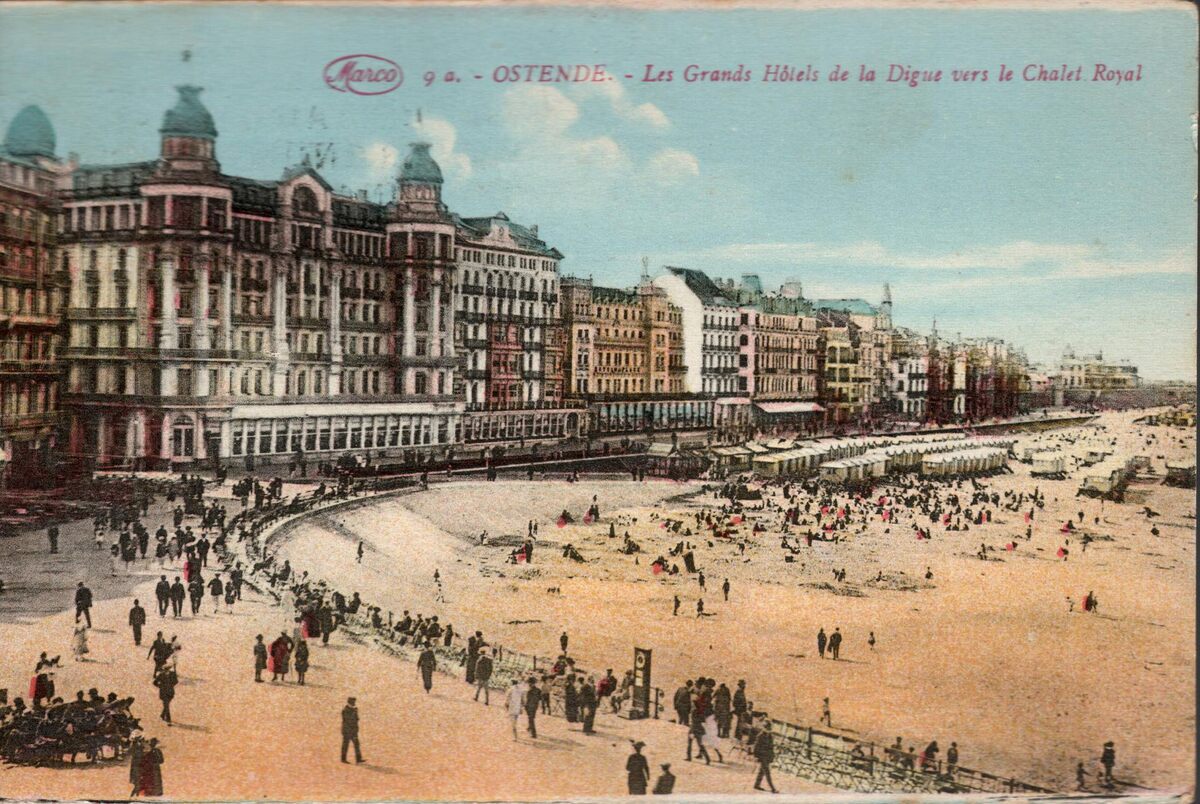 Marco, N° 9 a, 84. - Ostende - Les Grands Hôtels de la Digue vers le Chalet Royal. - Bijgekleurde kaart. - De Zeedijk gezien ten westen van de derde Kursaal richting het Koninklijk Chalet. Links, de grote hotels en rechts, strandrecreatie op het Groot Strand
