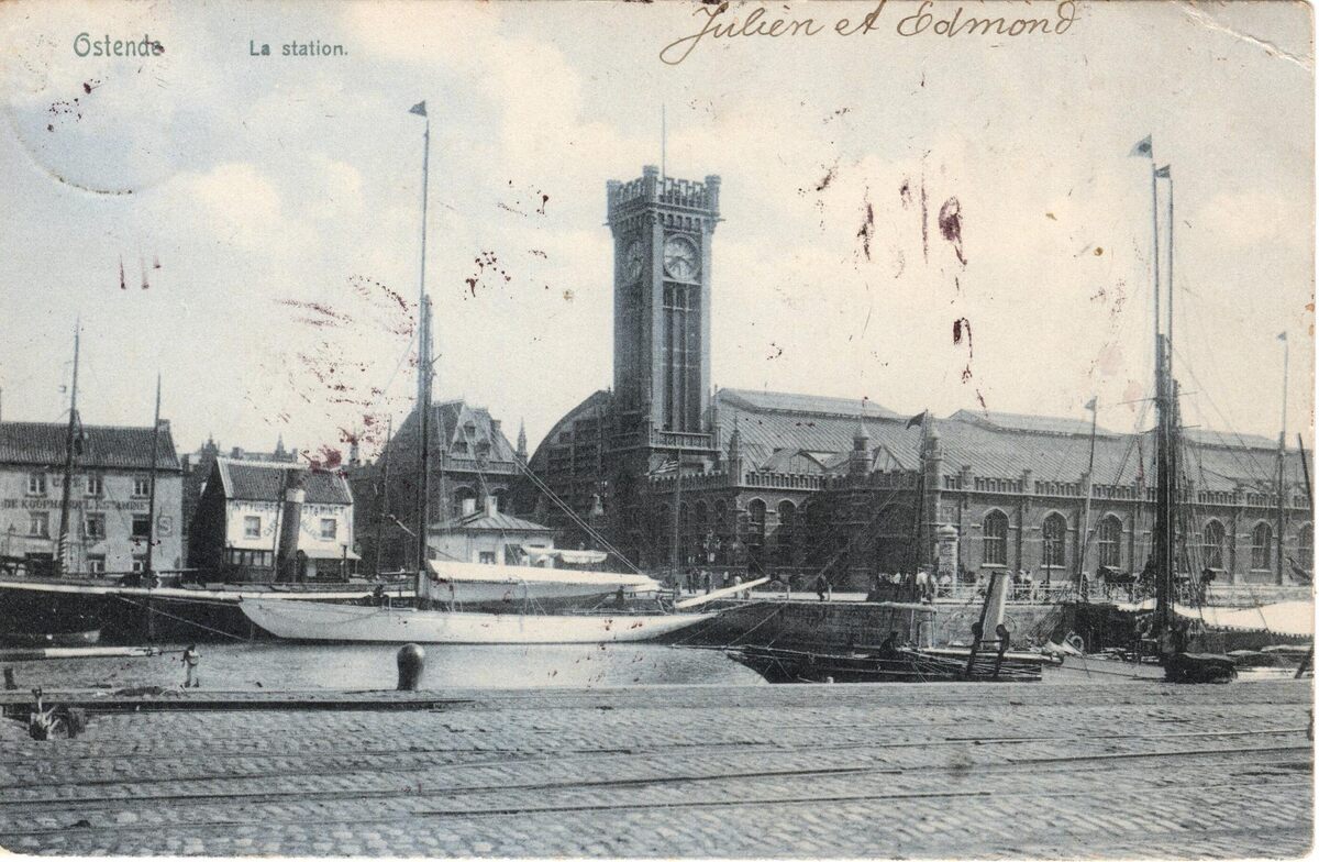 Photographie artistique Ed. Nels, Serie Ostende Delft, N° 20. - Ostende - la station. - Gelegen langs de Keizerskaai en de Vandersweepplaats op de wijk Hazegras. Links, ook langs de Keizerskaai, de estaminets "De Koophandel" en "In 't Vuurschip". Het kleine witte gebouw is het eerste politiebureau op de wijk. Een jacht ligt gemeerd in het eerste handelsdok. Vooraan, de tram- en treinsporen van de Keizerskaai.