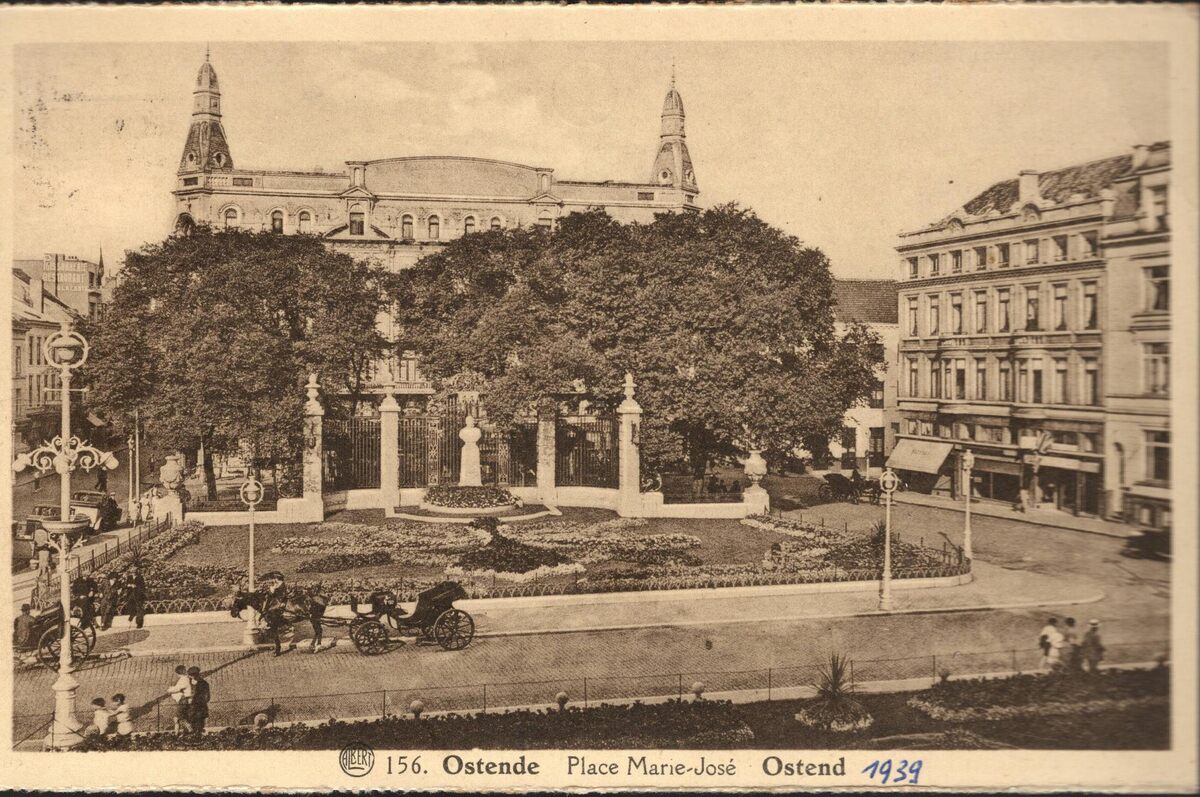 Albert, N° 156. Phototypie A. Dohmen, Bruxelles. - Het Marie-Joséplein met het huldemonument "Auguste Beernaert". Achter de bomen, het Bouchery gebouw. Koetsiers wachten op klanten in de Leopoldlaan.