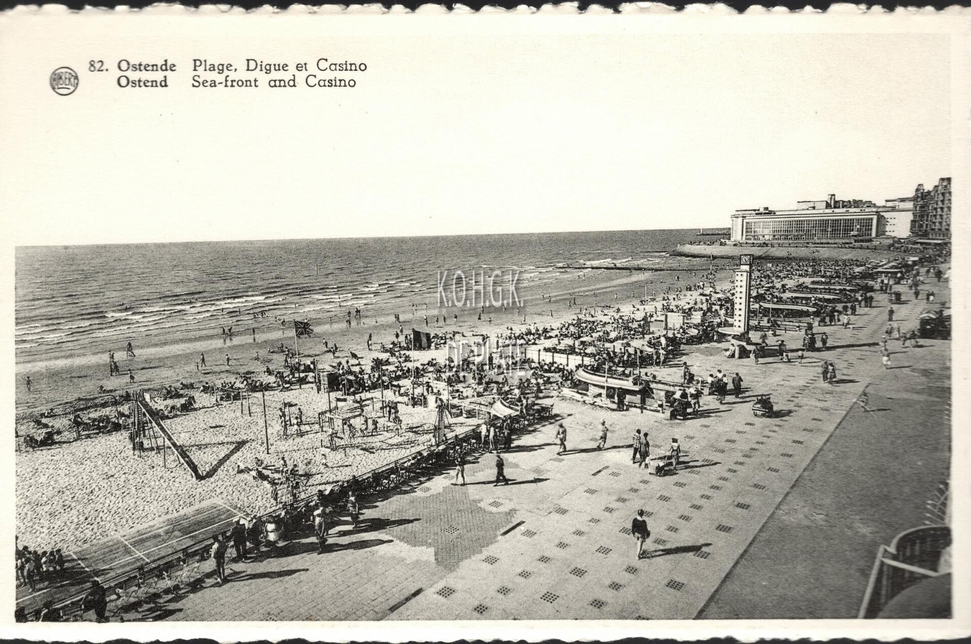 Albert, N° 82. Phototypie A. Dohmen, Bruxelles. - Ostende - Plage, Digue et Casino. Ostend - Sea-front and Casino. - Strandrecreatie op het Groot Strand ter hoogte van de badinstallaties onder de Albert I-promenade. Achteraan, de westgevel van de vierde Kursaal.