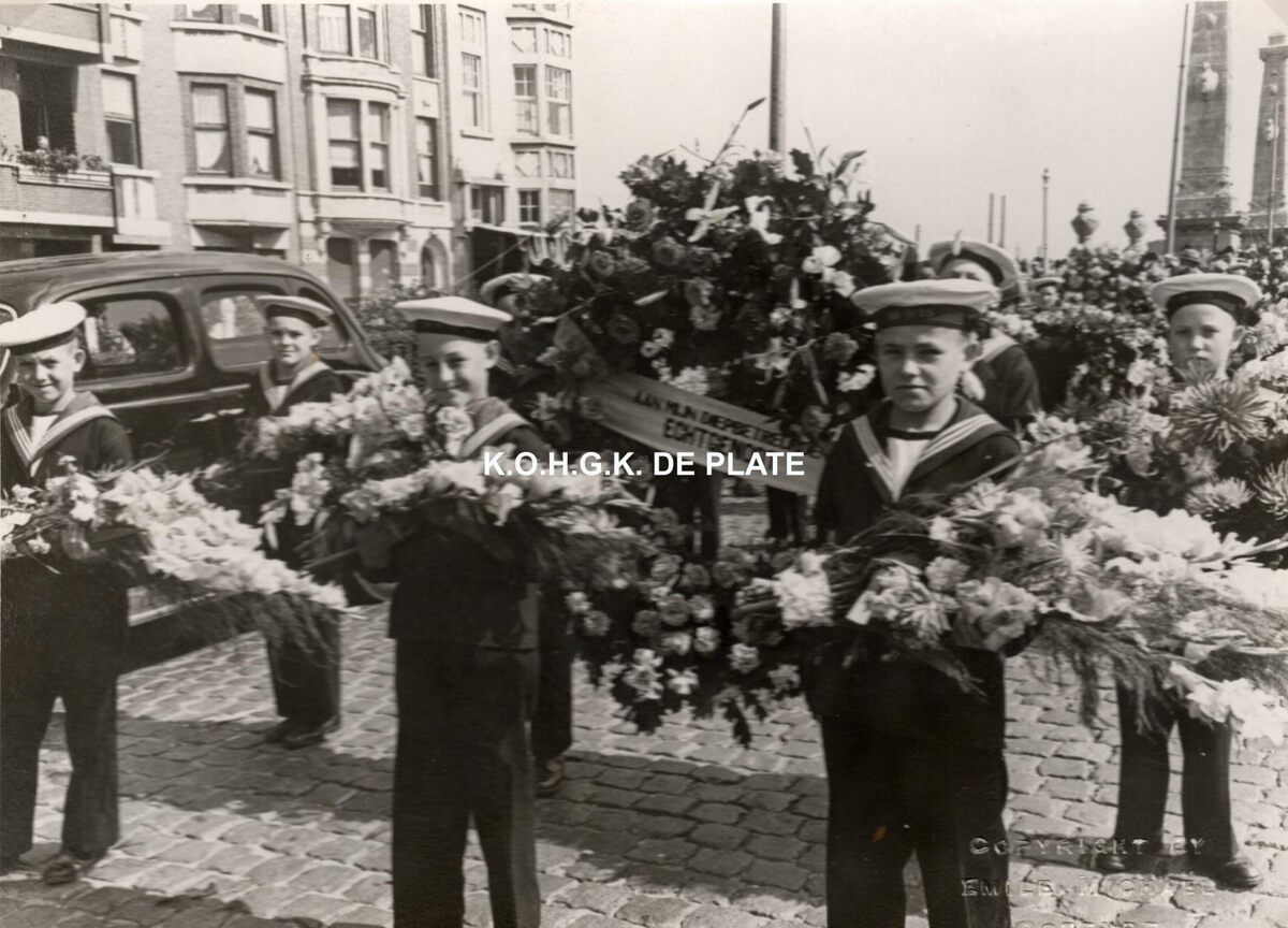 Formaat : 13 x 18 cm. - Leerlingen van het Koninklijk Werk IBIS dragen bloemenkransen in de begrafenisstoet in de Graaf de Smet de Naeyerlaan, waar August Brunet woonde op net nummer 98