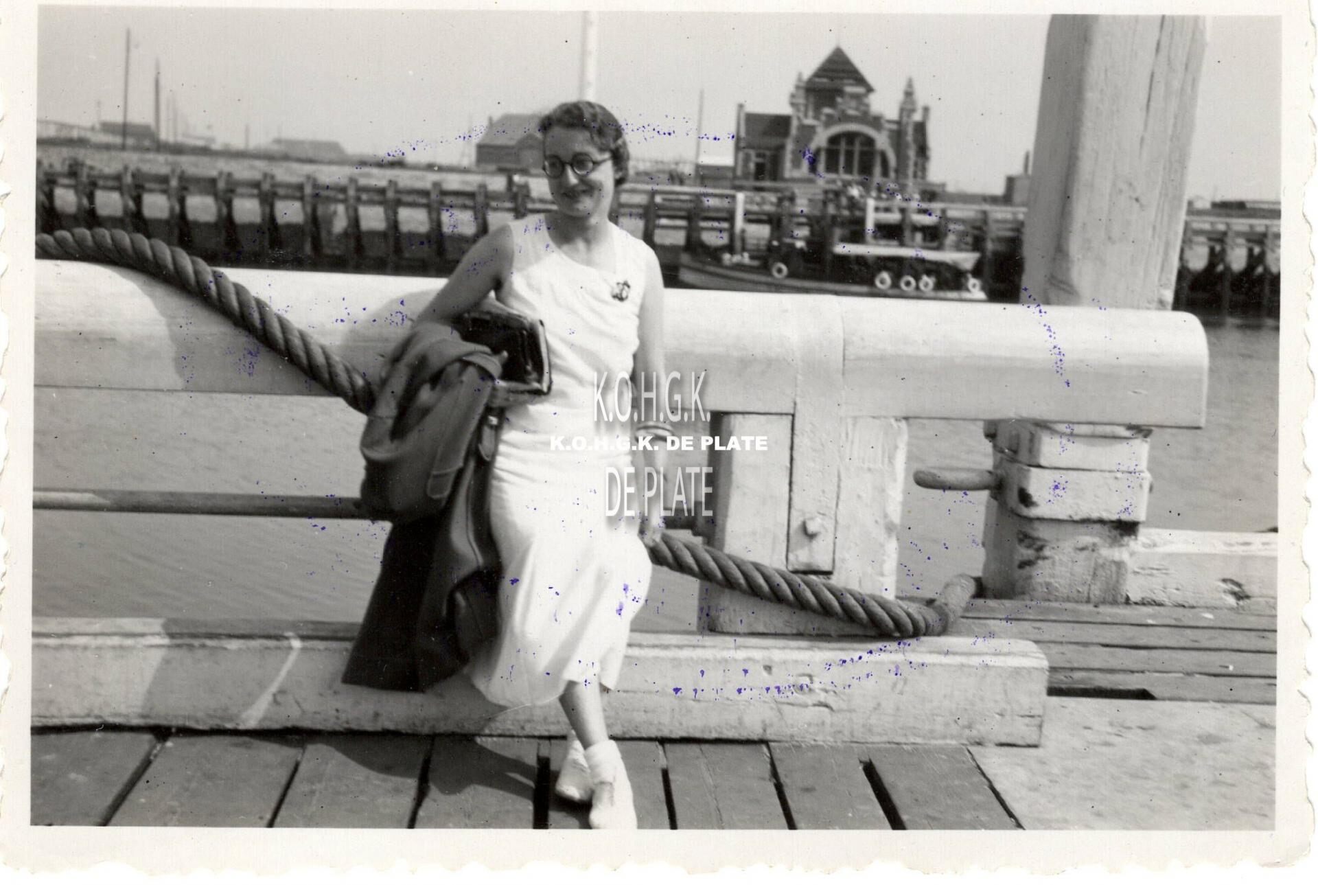 Formaat : 5,5 x 8 cm. - Vrouw poserend op het Weststaketsel met zicht op de Oosteroever, Ooststaketsel en het quarantainegebouw