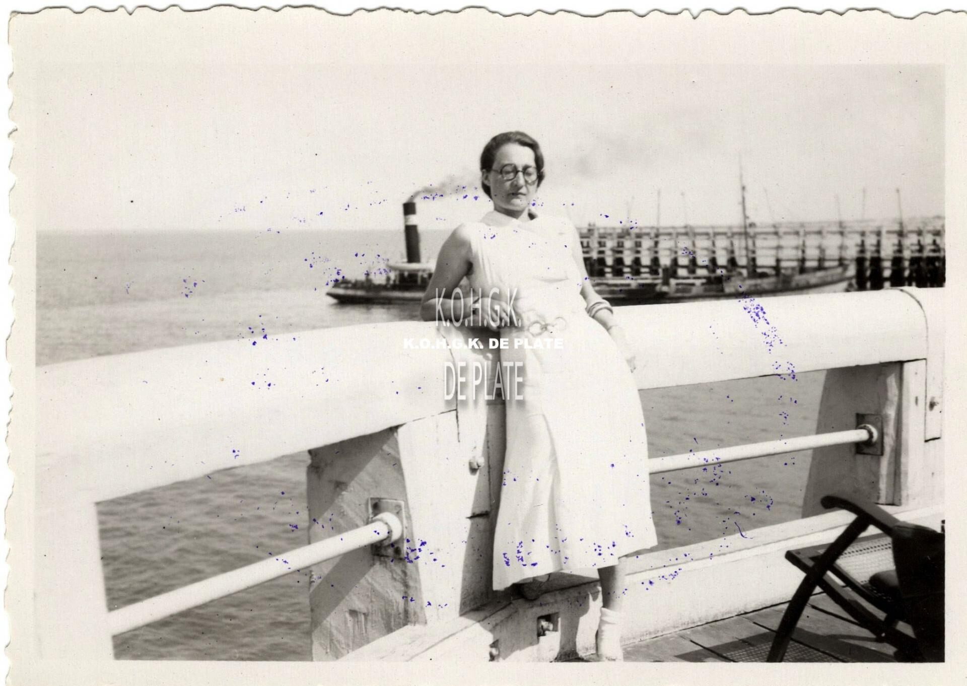 Formaat : 5,5 x 8 cm. - Vrouw poserend op het einde van het Weststaketsel. In de achtergrond het Ooststaketsel.