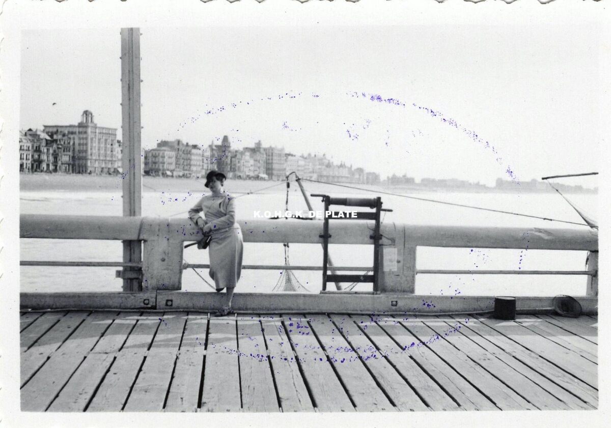 Formaat : 5,5 x 8 cm. - Vrouw poserend op het Weststaketsel ter hoogte van het Klein Strand. In de achtergrond een mooi zicht van de stad