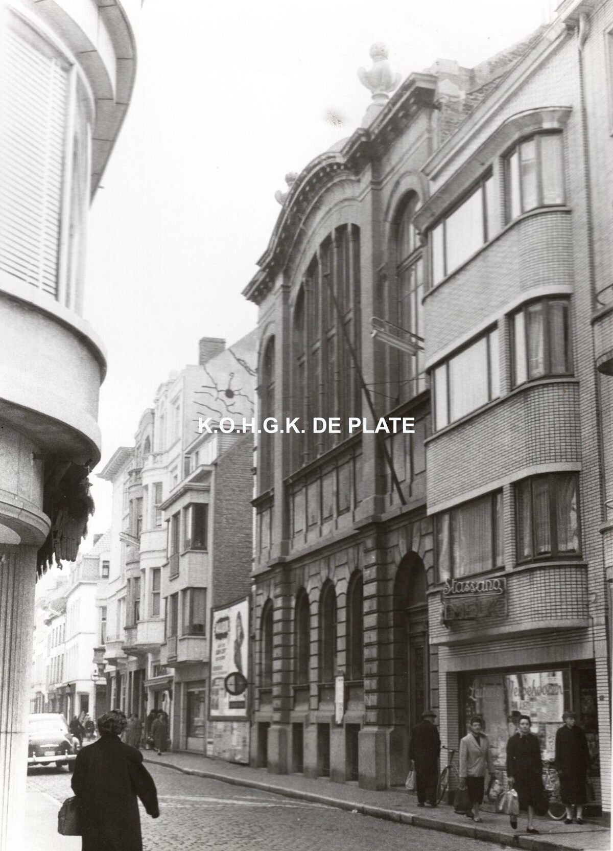 Formaat : 17 x 12 xm. Rechts laiterie Verschooren met verlichtingsreclame voor Stassano melk aan de gevel. Links ernaast het schoolgebouw in de Ooststraat 29