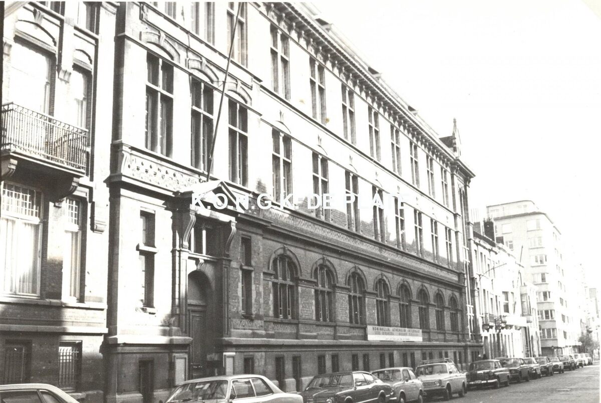 Formaat : 8 x 12 cm. De kostschool in de Rogierlaan 10-12. - Schoolgebouw opgetrokken in 1900-1901 naar ontwerp van Joseph Caluwaers (atheneum) en Achille Raoux (kostschool); hiervoor worden enkele huizen en de Sint-Jozefskerk (1889) gesloopt.