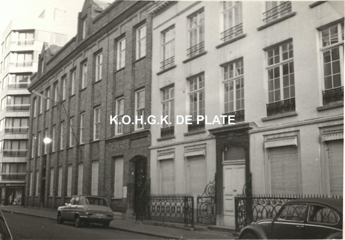 Formaat : 8 x 12,5 cm. - Schoolgebouw Kaaistraat 16-20. Voorheen Sint Jozefslyceum op nummer 16. Het witte gebouw rechts met de smeedijzeren hekkens is het ouderlijke huis van Jan Piers.