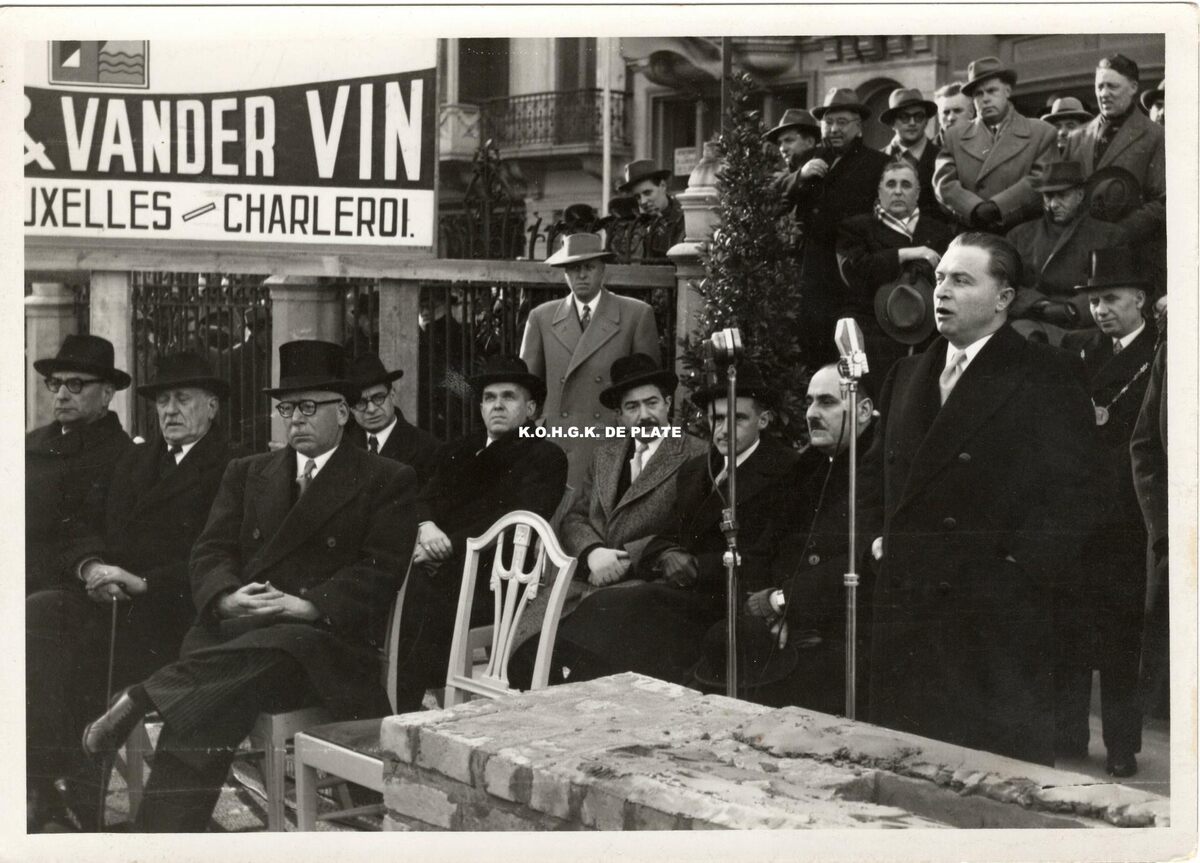 Formaat : 12 x 17 cm. - Zittend v.l.n.r. Minister Buisseret, staatsminister Gillon, burgemeester Henri Serruys, minister Rey, minister Adolf Van Glabbeke, kamerlid De Kinder, gouverneur Van Outryve d'Ydewalle, secretaris-generaal van openbare werken Willems en de spreker eerste minister Gaston Eyskens op de eerste steenlegging van het kursaal.