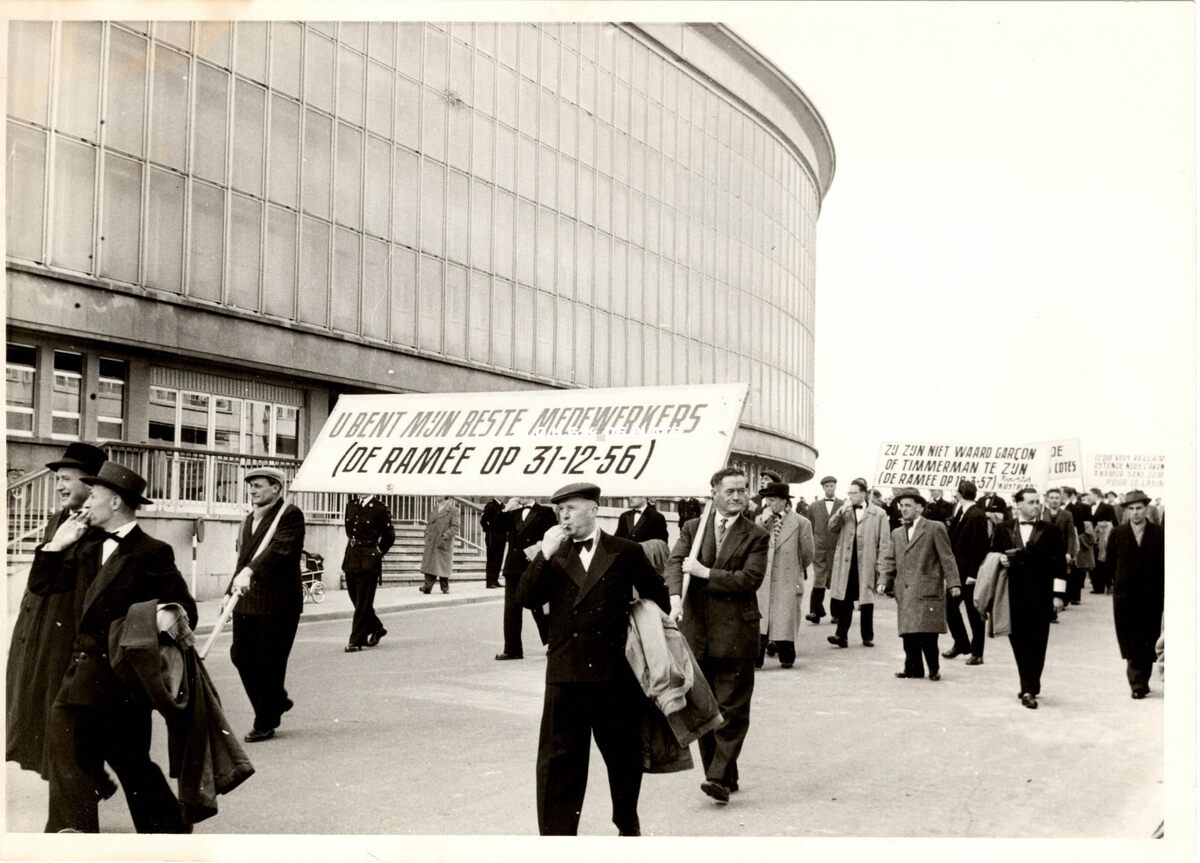 Formaat : 12 x 17 cm. - Staking van de croupiers op 28 maart 1957. De man met het fluitje vooraan is Henri Chapel.