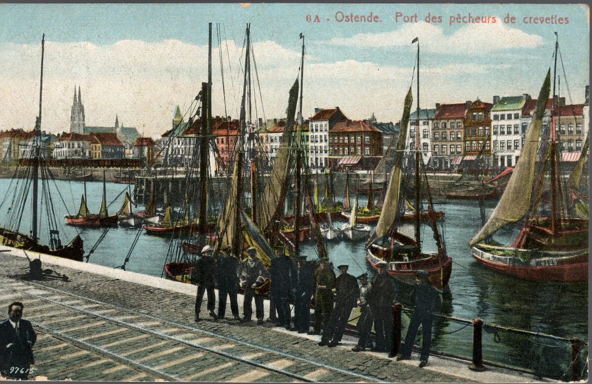 Marco, 6 A. - Ostende - Port des pêcheurs de crevettes. - Bijgekleurde kaart. - Vissers poseren waar nu de Sir Winston Churchillkaai is. Vooraan, de treinsporen die leiden naar de Oude Vismijn (de Cirk), waar de vistreinen vertrokken. In het Schuildok liggen Oostendse schovers en éénmast zeilvissersvaartuigen. Op de achtergrond, de Visserskaai