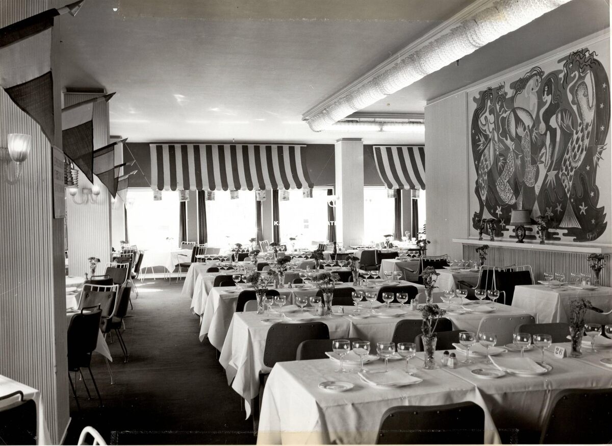 Formaat : 17 x 23,5 cm. - een mooi binnenzicht van restaurant "Périgord" in het vierde kursaal. Rechts aan de muur hangt een werk van E. Decock. Een tafereel van zeemeerminnen en andere zeedieren.