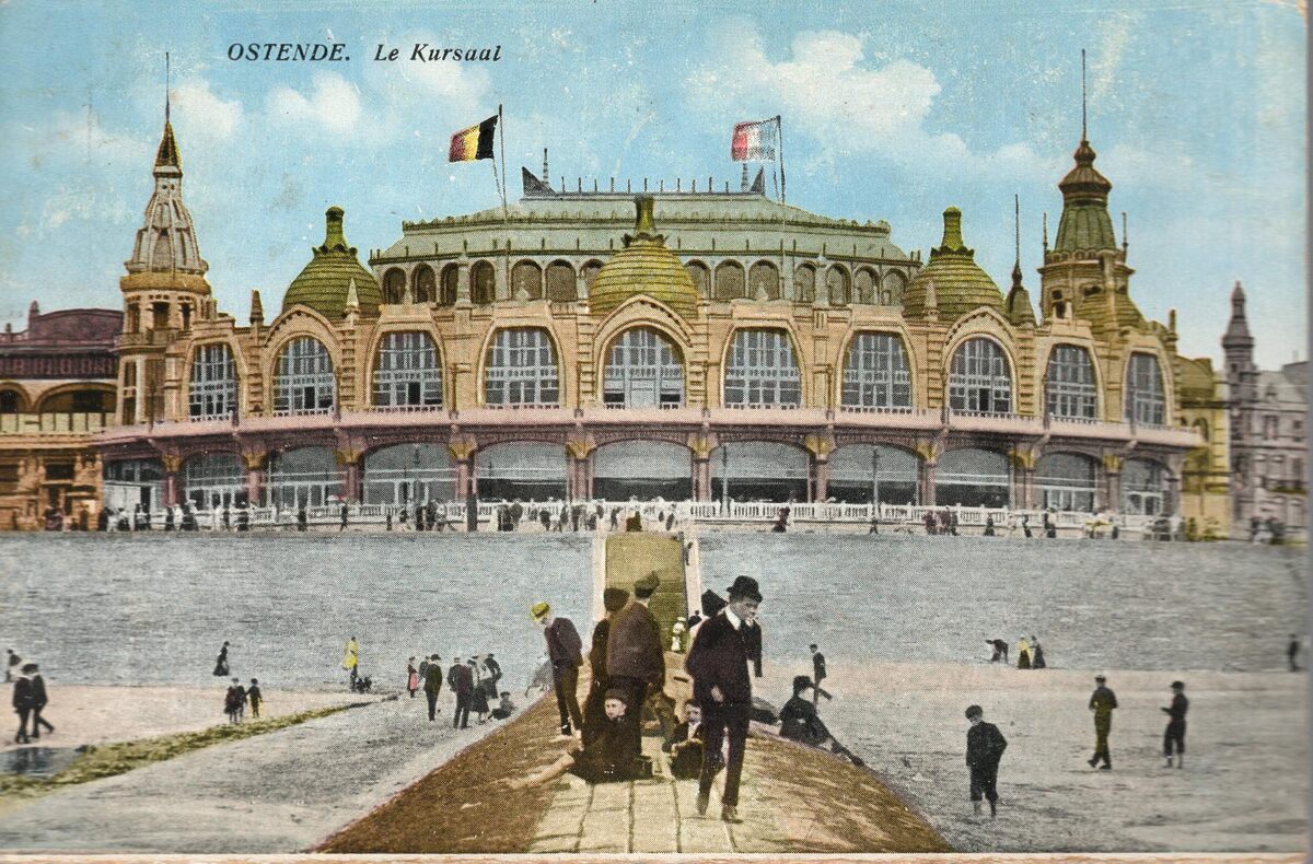 Ch. N. Br. - Ostende - Le Kursaal. - Bijgekleurde kaart. - De noordgevel van de derde Kursaal langs de Zeedijk, gezien van op een golfbreker op het Groot Strand