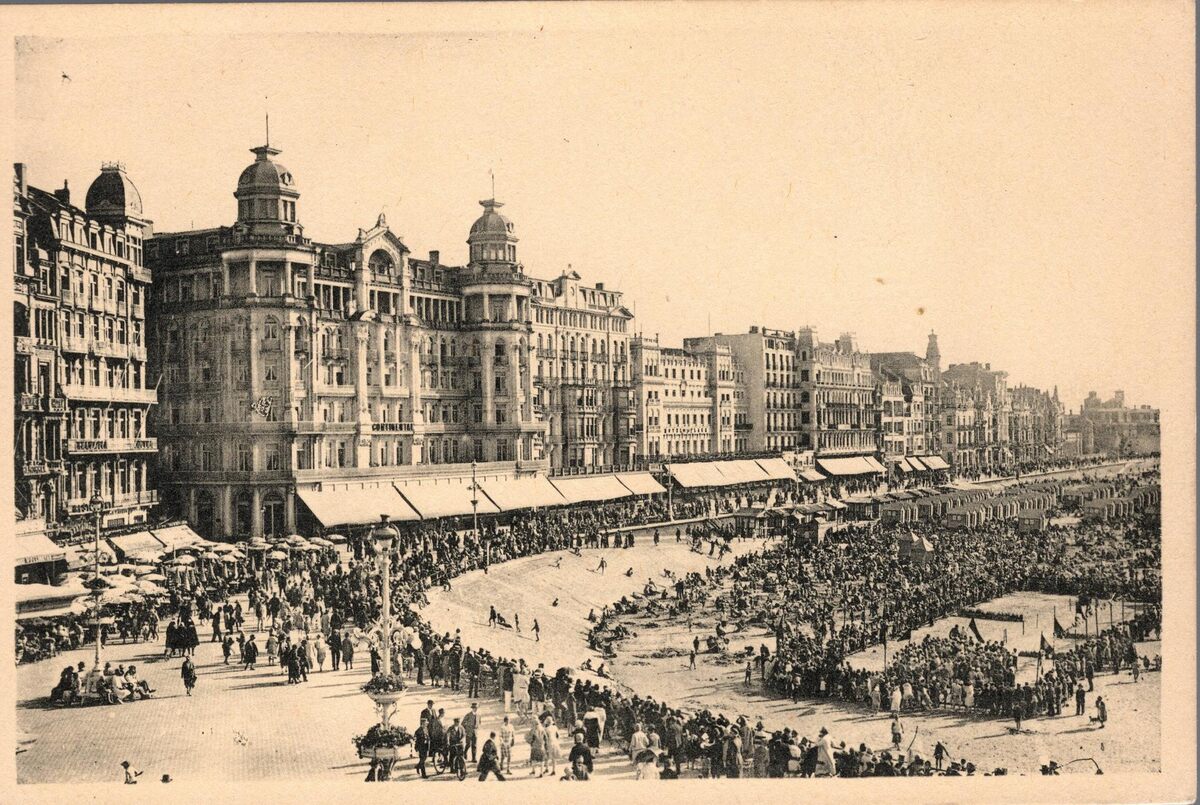 Edit. Arfo, Bruxelles. - Ostende - La Digue et la Plage. Oostende - Dijk en Strand. - De Zeedijk vanaf de Kursaal richting het Koninklijk Chalet. Op de hoek met de Ijzerstraat, het "Hotel Continental". Let op de sierlijke lantaarns. Strandrecreatie op het Groot Strand en de traditionele badkarren. Rechts onder, een evenement is aan de gang. Oostende in het interbellum.