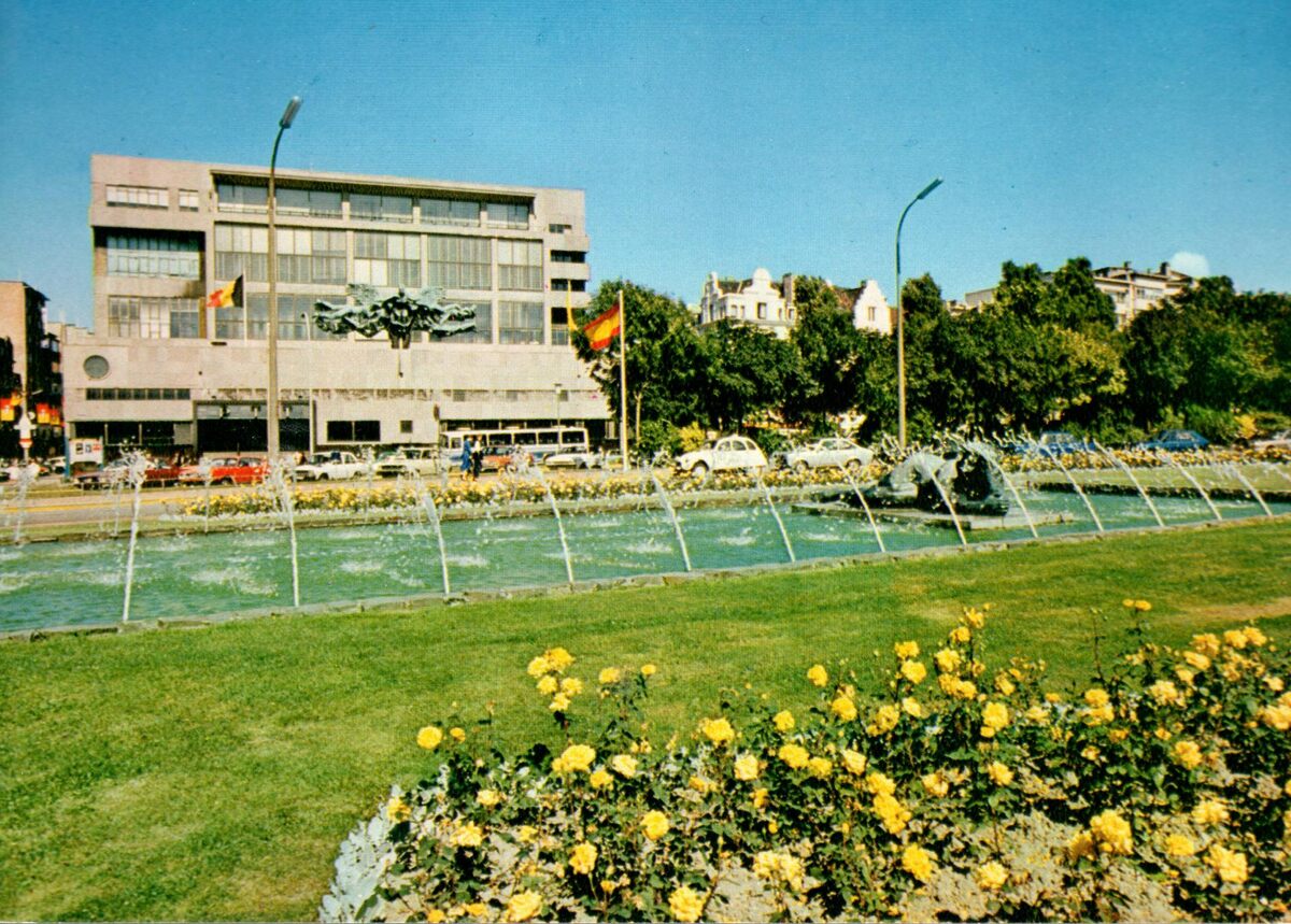 AVM. - Oostende - Postgebouw. Ostende - Bureau de Poste. Ostend - Post-Office. Ostende - Postambt. - Het Postgebouw gelegen langs de Hendrik Serruyslaan. In het midden, met langs beid zijden omringd door de Leopold II-laan, het beeldhouwwerk van George Grard "De Zee", in de volksmond "Dikke Mathille"